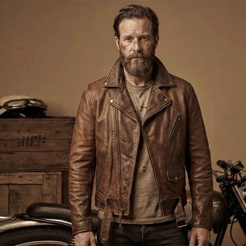 Made from premium distressed leather, it features a rich brown finish. The worn-in texture enhances its authentic character. An asymmetrical front zipper adds bold detail. Structured lapels strengthen the classic biker look. Durable metal hardware completes the design.