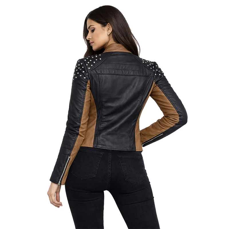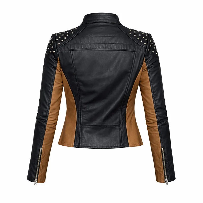 1x Women’s genuine leather biker jacket (black & tan, studded shoulder design)